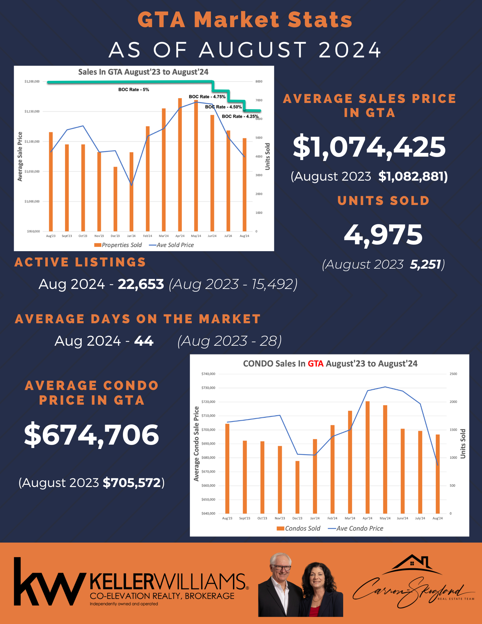 Greater Toronto Area (GTA) home sales were down on a year-over-year basis in August 2024. New listings were up slightly over the same period. While the region’s housing market remained well-supplied in August, average home prices only edged slightly lower compared to August 2023.